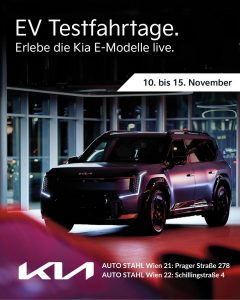 Erleben Sie die Zukunft der Mobilität hautnah: Vom 10. bis 15. November laden wir Sie zu den KIA EV-Testdrive Days bei AUTO STAHL in Floridsdorf und in der Donaustadt ein. Lernen Sie die vollelektrische Modellvielfalt von KIA kennen, lassen Sie sich von innovativer Technik begeistern – und spüren Sie, wie komfortabel, effizient und vielseitig Elektromobilität sein kann.